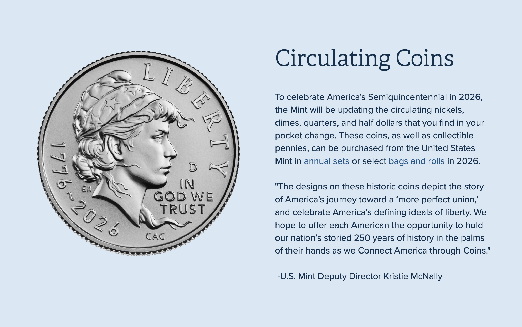 The Circulating Collectible Coin Redesign Act of 2020 authorized the Semiquincentennial coins and required that their designs be developed in consultation with the Commission of Fine Arts (CFA), reviewed by the Citizens Coinage Advisory Committee (CCAC), coordinated with the U.S. Semiquincentennial Commission, and informed by public input.